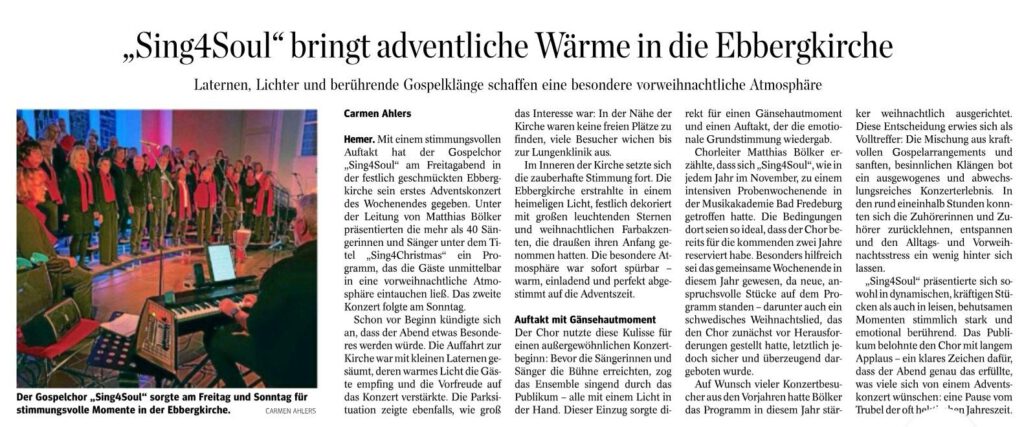 Die beiden Konzerte „Sing4Christmas“ am 12. und 14. Dezember 2025 waren wieder wunderbar – eine schöne adventliche Stimmung in der (zumindest Sonntag) proppenvollen Kirche. Das war am 15.12. auch in der Zeitung zu lesen: