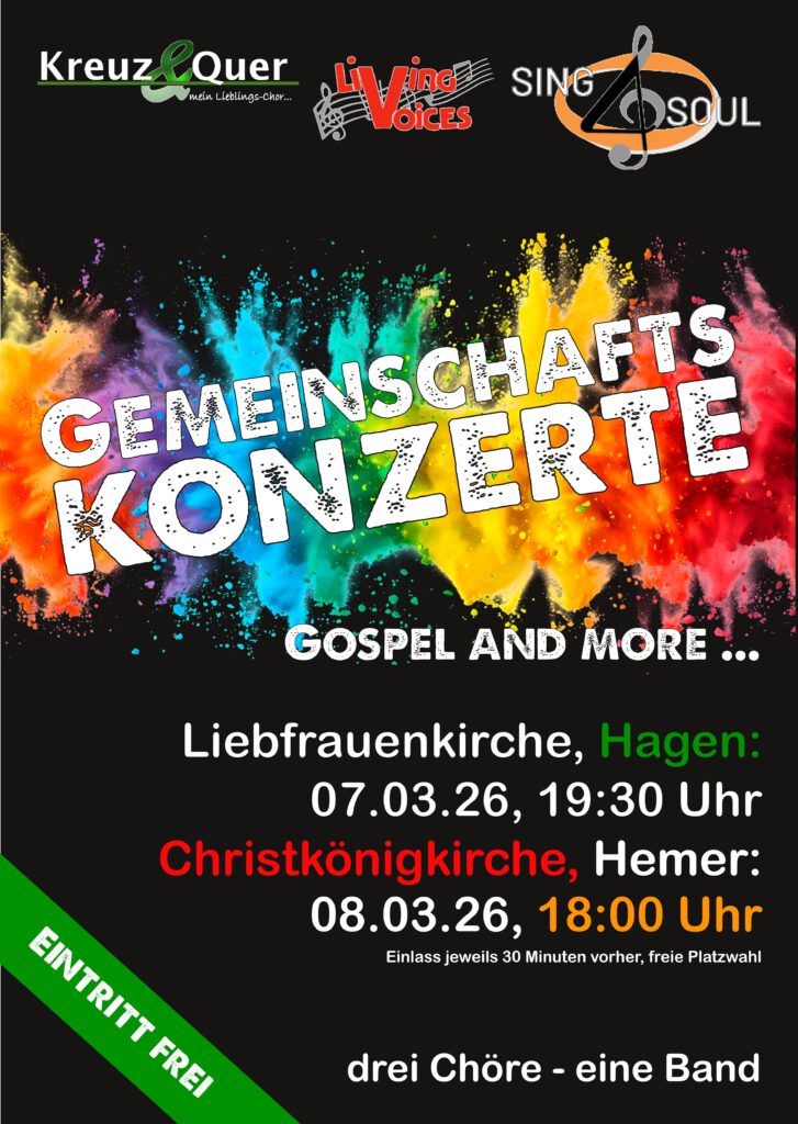 Gerade erst haben wir unsere zwei Konzerte „Sing4Christmas“ in der Ebbergkirche gespielt, da schauen wir schon auf das nächste Jahr. Im März 2025 gab es ein erstes Gemeinschaftskonzert der drei Chöre „Kreuz&Quer“ (Hagen), „Living Voices“ (Hagen) und „Sing4Soul“ (Hemer), das so erfolgreich war, dass wir es 2026 wiederholen wollen. Diesmal gleich zweimal am 1. Märzwochenende.